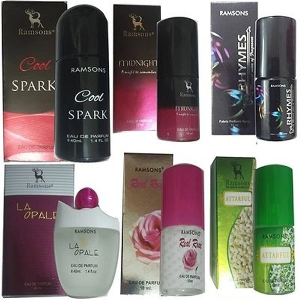 EACH COMBO PACK CONTAINS - 1 RAMSONS COOL SPARK PERFUME 40 ML+1 RAMSONS LA OPALE PERFUME 40 ML+1 RAMSONS MIDNIGHT PERFUME 10 ML+1 RAMSONS RHYMES PERFUME 10 ML+1 RAMSONS REAL ROSE PERFUME 10 ML+1 RAMSONS ATTARFUL PERFUME 10 ML
