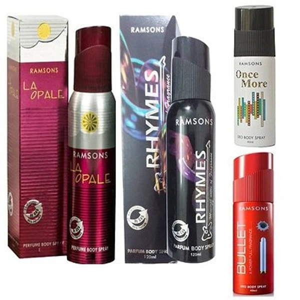 EACH COMBO PACK CONTAINS - 1 RAMSONS LA OPALE PERFUME BODY SPRAY (120ML) + 1 RAMSONS RHYMES PERFUME BODY SPRAY (120ML) + 1 RAMSONS ONCE MORE DEO BODY SPRAY (40ML) + 1 RAMSONS BULLET DEO BODY SPRAY (40ML)