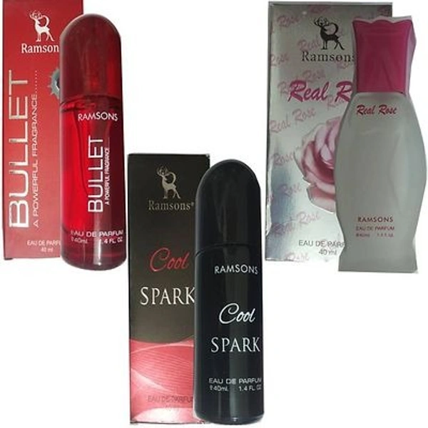 EACH COMBO PACK CONTAINS - 1 RAMSONS BULLET PERFUME 40 ML+ 1 RAMSONS COOL SPARK PERFUME 40 ML+ 1 RAMSONS REAL ROSE PERFUME 40 ML
