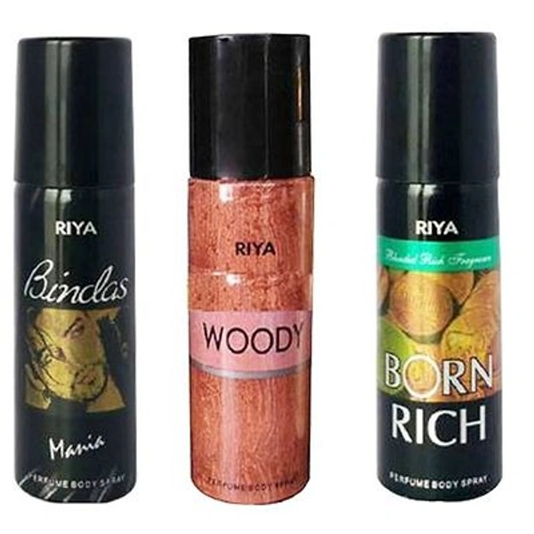 EACH COMBO PACK CONTAINS- 1 RIYA BINDAS MANIA BODY SPRAY ( 150 ML) + 1 RIYA BORN RICH BODY SPRAY ( 150 ML) + 1 RIYA WOODY BODY SPRAY ( 150 ML)