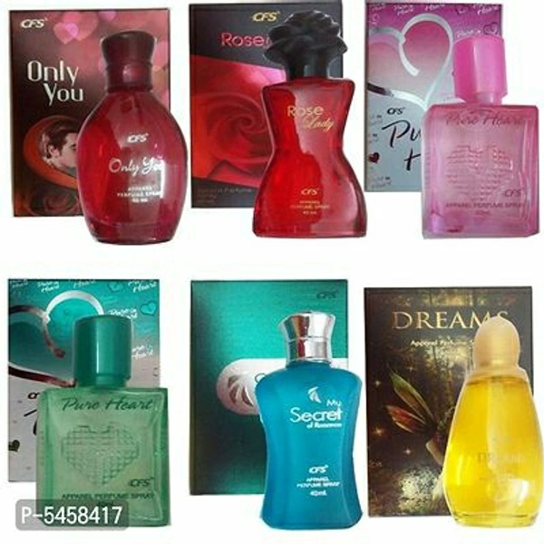 EACH COMBO PACK CONTAINS- 1 CFS PURE HEART PINK PERFUME(40ml)+ 1 CFS PURE HEART BLUE PERFUME(40ml) + 1 CFS ONLY YOU PERFUME(40ml)+ 1 CFS MY SECRET OF ROMANCE PERFUME(40 ML)+ 1 CFS DREAMS PERFUME(40ml)+ 1 CFS ROSE LADY PERFUME(40ml)