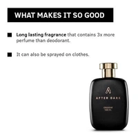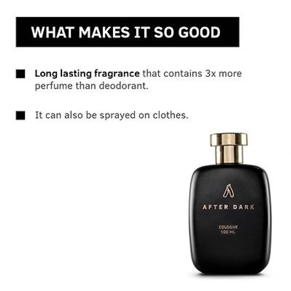 After dark is a bold and intense fragrance. It is unique in its composition and very unlike fragrances that are available. A deep, sensual and sizzling fragrance that makes things better after dark. If long-lasting and strong fragrance is your thing then this one's for you. Loaded with 3x more fragrance than deodorant and no gas, this cologne will make sure you smell great, till late.
