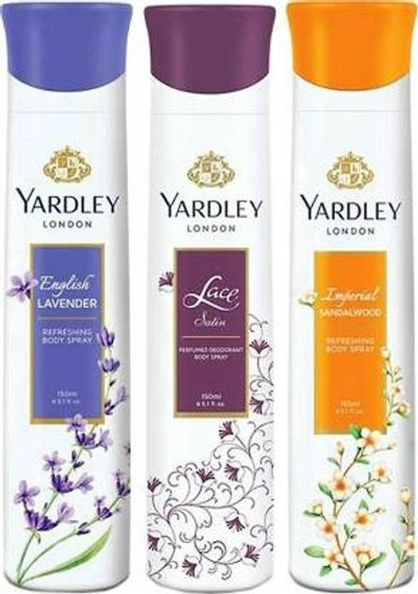 Sales Package: Yardley English Lavender Deodorant Spray - For Women(150 ml), Yardley Lace Satin Deodorant Spray - For Women(150 ml), Yardley Sandalwood Deodorant Spray - For Women(150 ml) Set Content: English Lavender Deodorant Spray - For Women(150 ml), Lace Satin Deodorant Spray - For Women(150 ml), Sandalwood Deodorant Spray - For Women(150 ml) Ideal For: Women